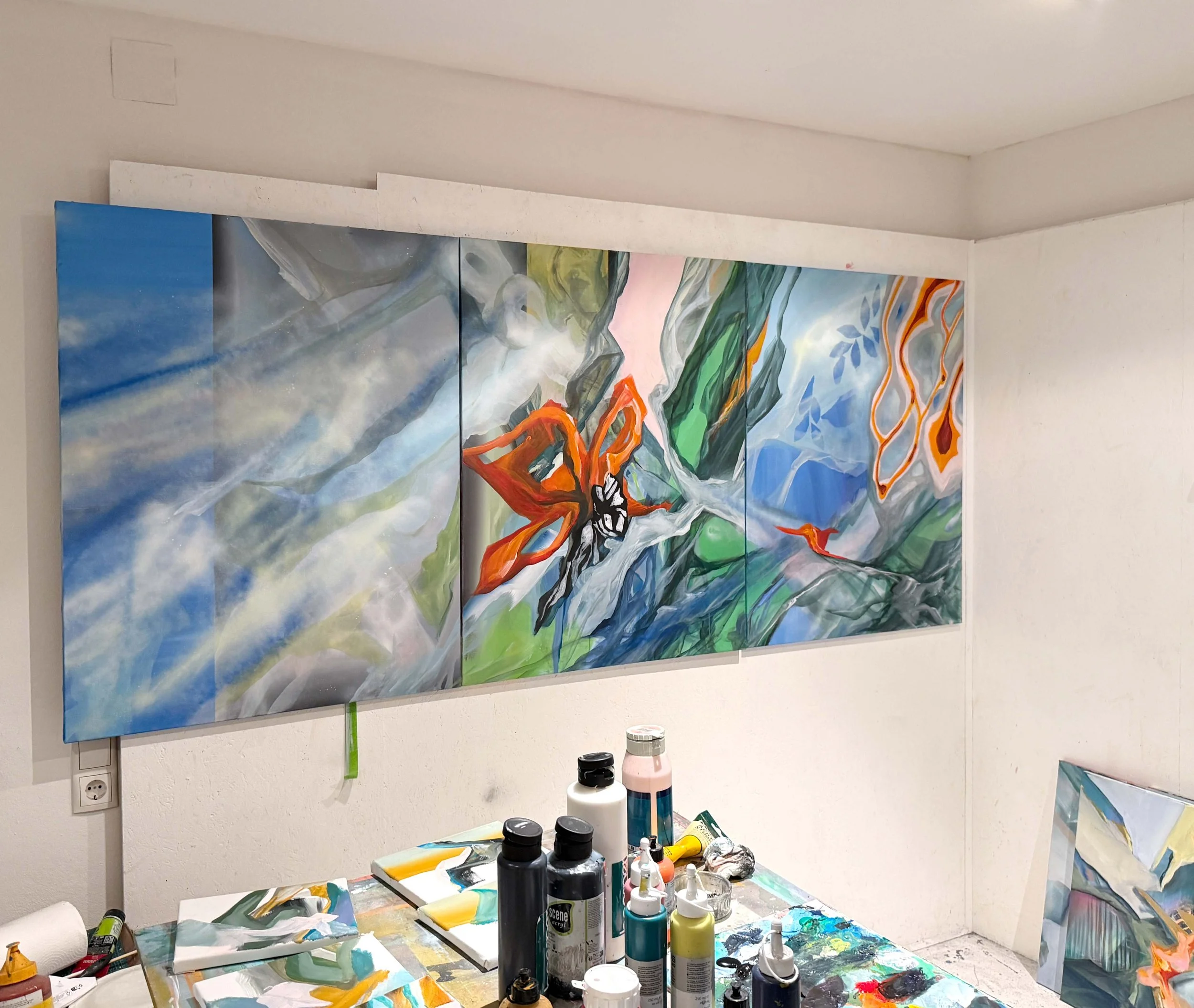 Work in Progress of Flora Triptychon, Acrylic, pigments on canvas, 2026, 240x100cm, Graduation work Fine Art Academy (ADBK-K), class: Markus Lüpertz