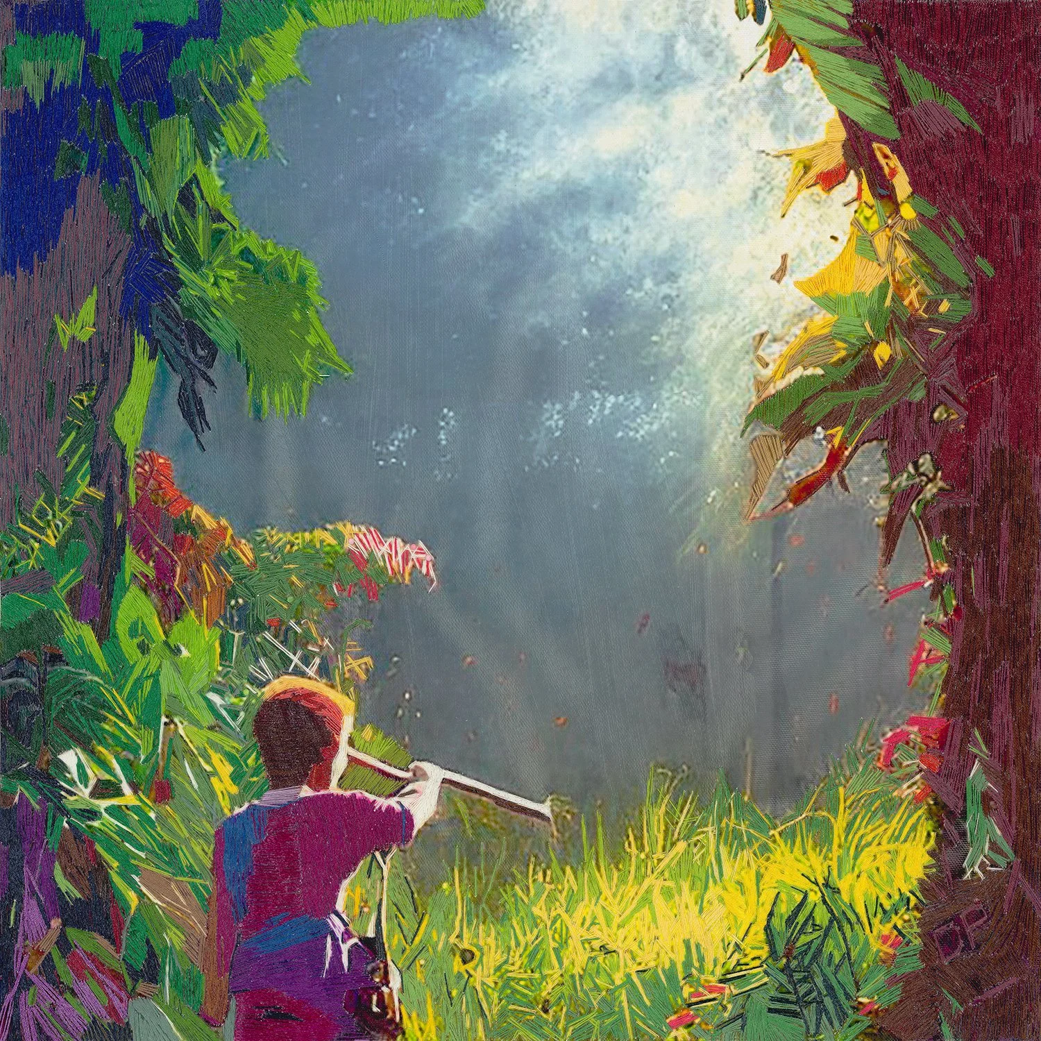 Boy in the Tree 2025 45.72 x 45.72 centimeters Embroidery on canvas
