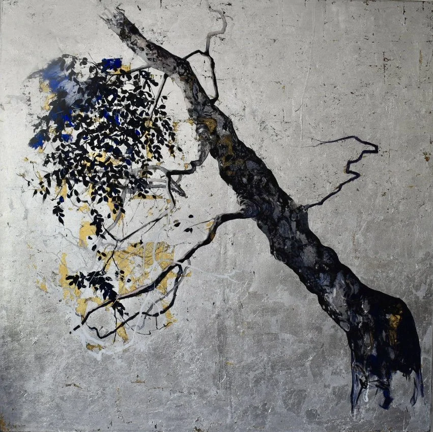 Old oak, 2023,ink and silver leaves on canvas,160x160cm