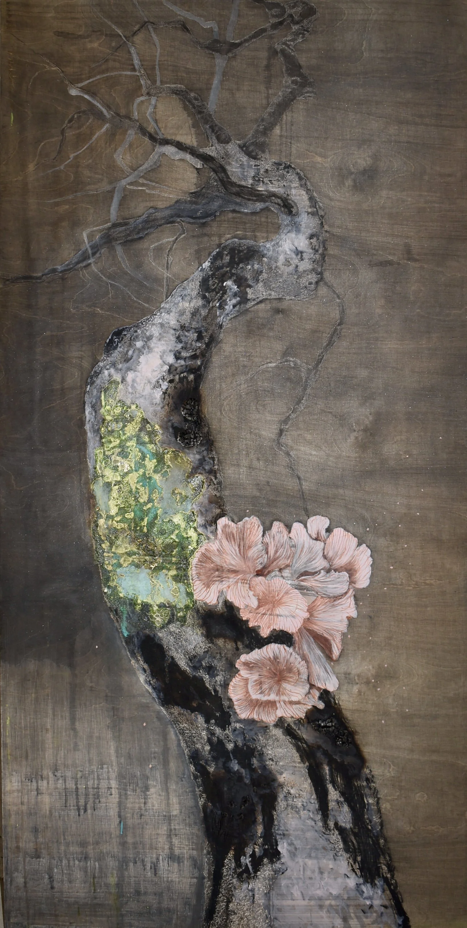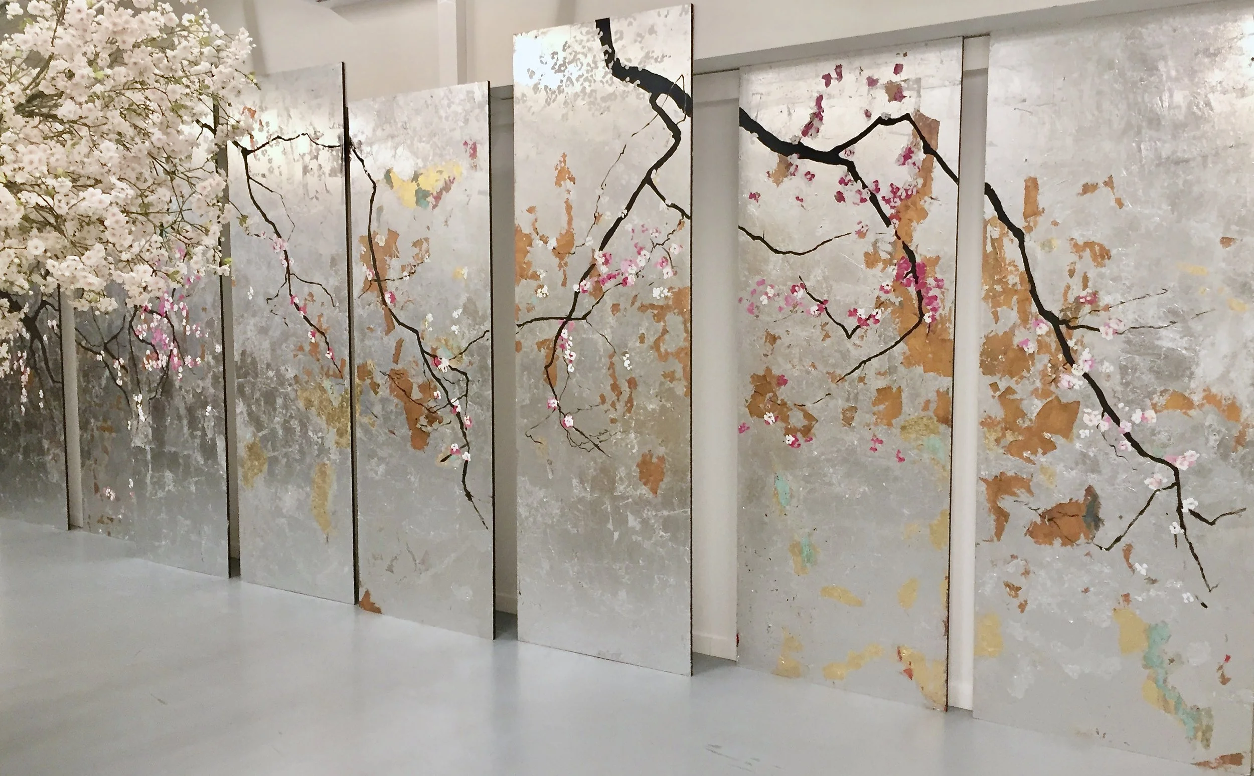 Apple blossom,2020, ink and silver/copper leaves on wood, 230x900cm
