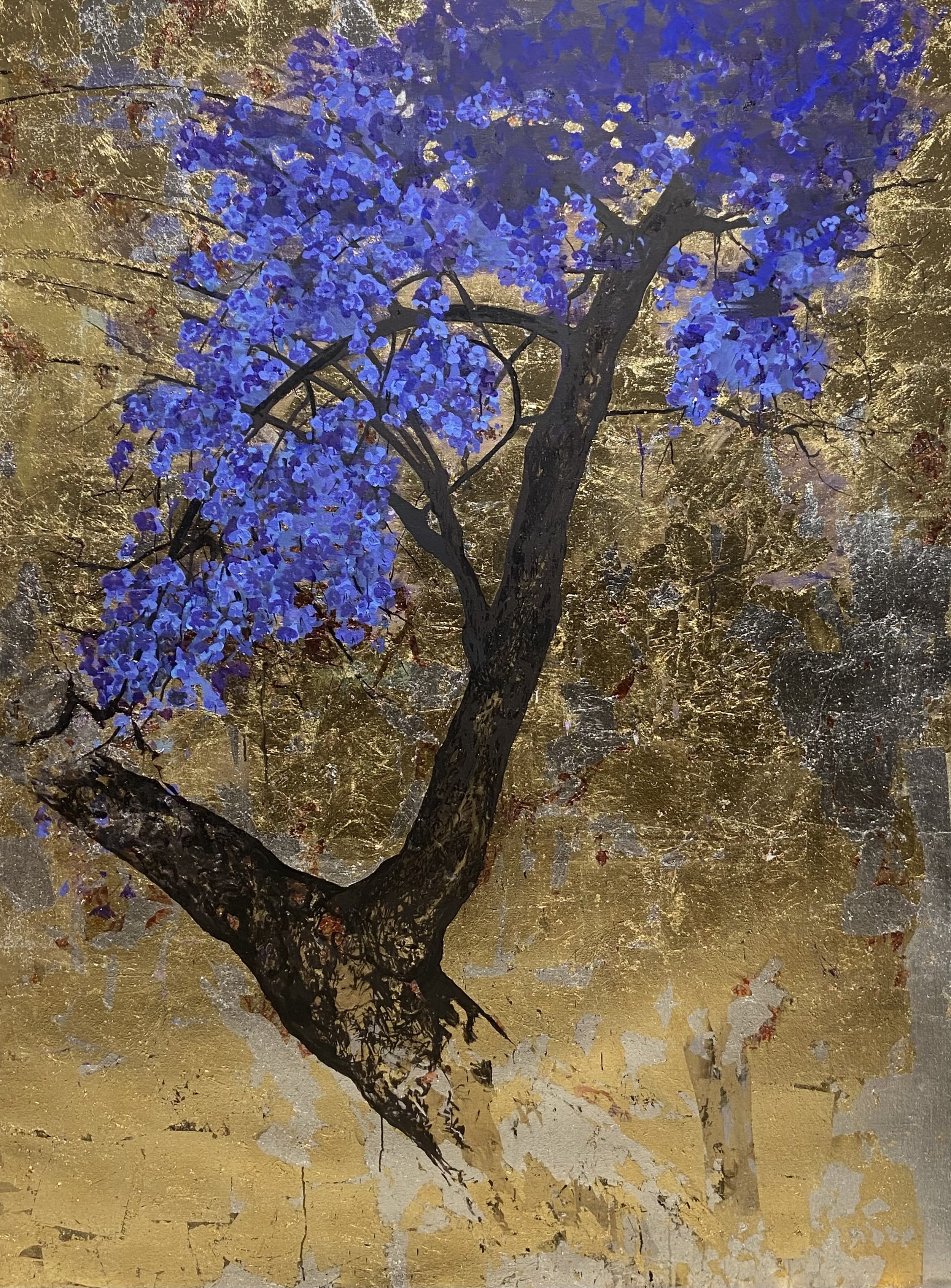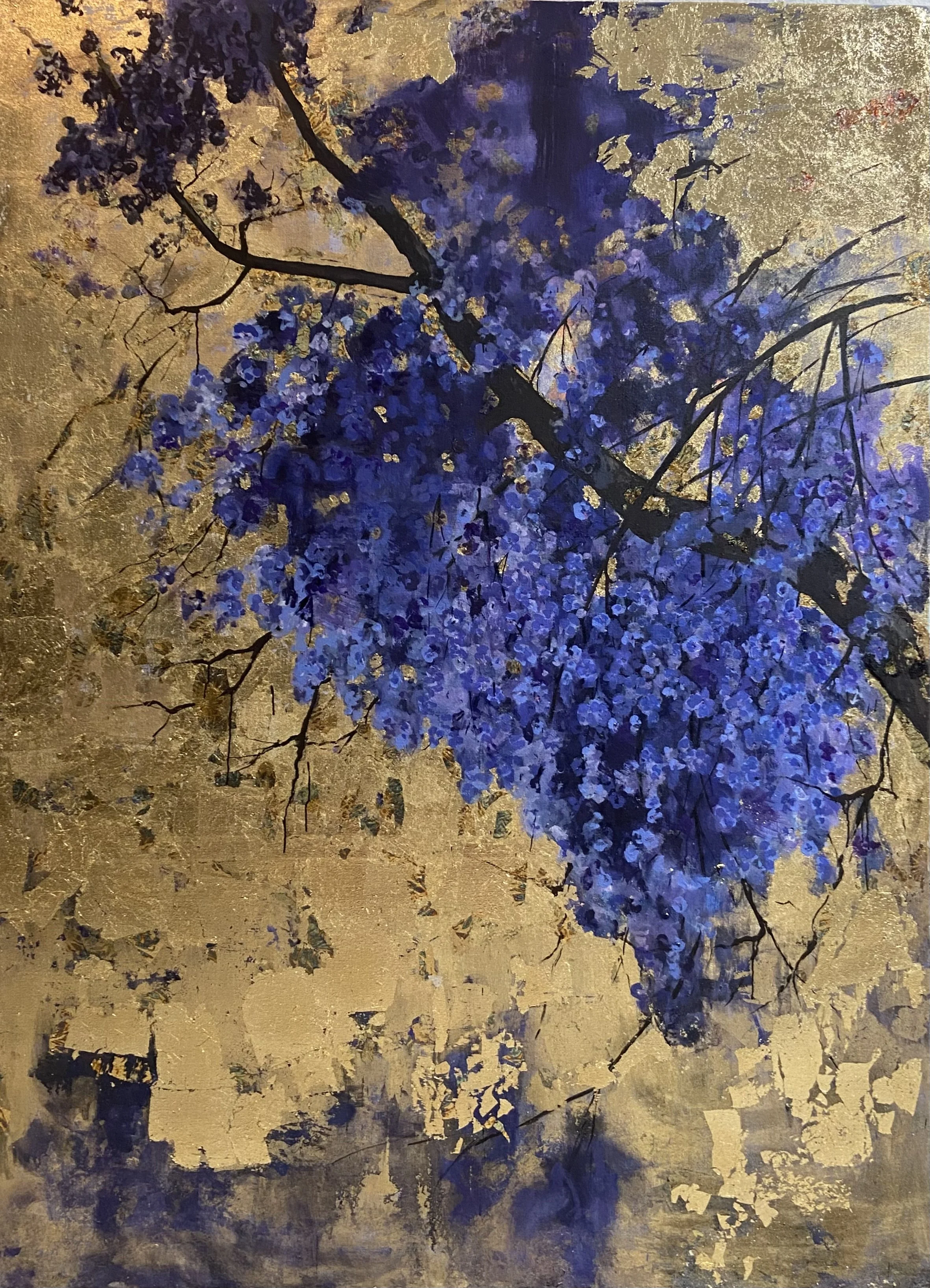 Jacaranda, 2023,ink and gold leaves on linen, 170 x 230 cm