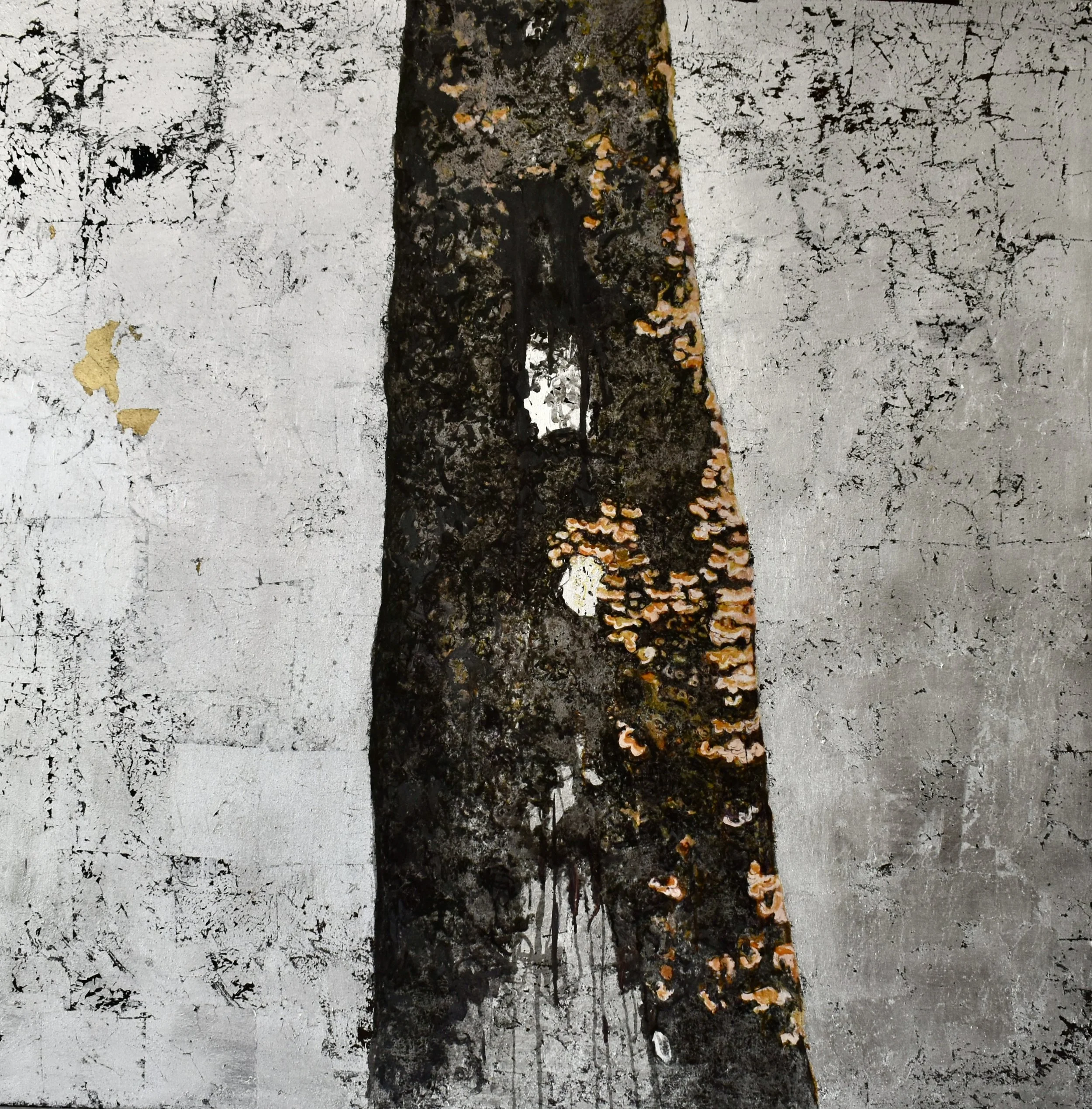 Still alive, 2024,ink and silver leaves on canvas, 160x160cm