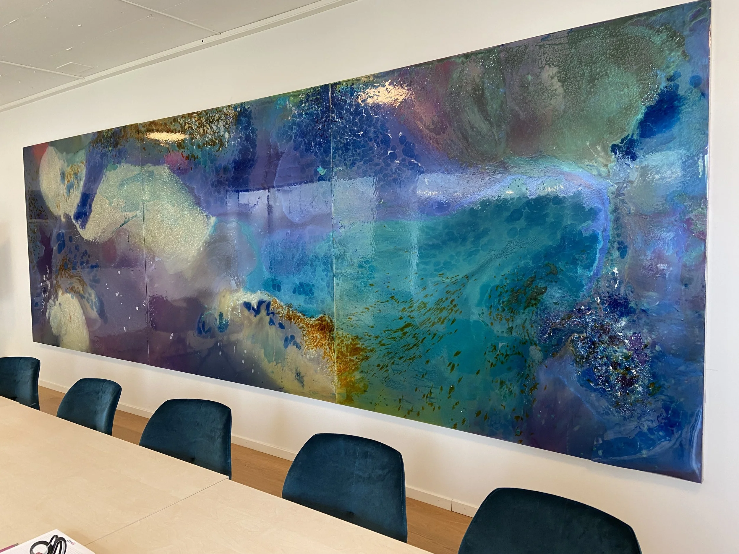 The scale of many of your works, especially those installed in public institutions such as the Technical University in Stockholm or the Swedish Embassy, invites a different mode of viewing than that of the traditional gallery painting. When working within architectural or civic spaces, how do you consider the viewer’s bodily movement and temporal experience of the work, and do you approach these commissions as opportunities to construct a dialogue between art, public consciousness, and the everyday environment?