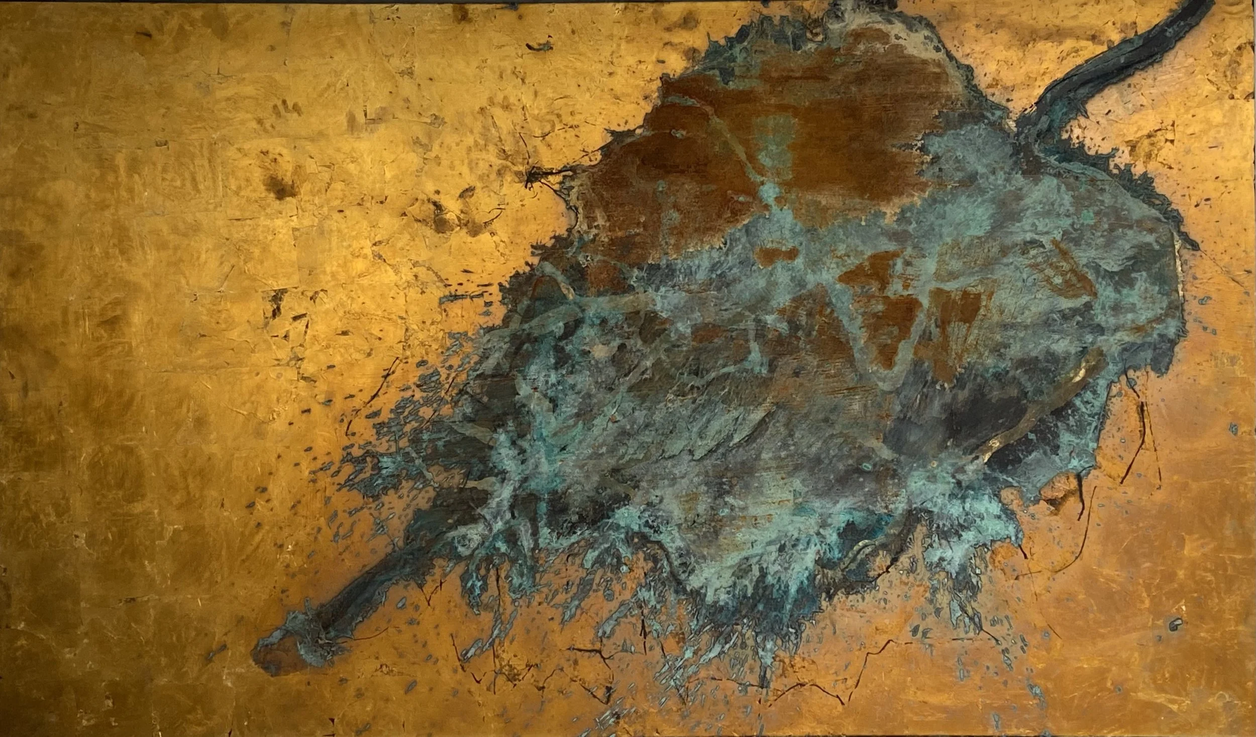 Leaf,2022,gold, Rust and etching on Metal, 120 x 200 cm
