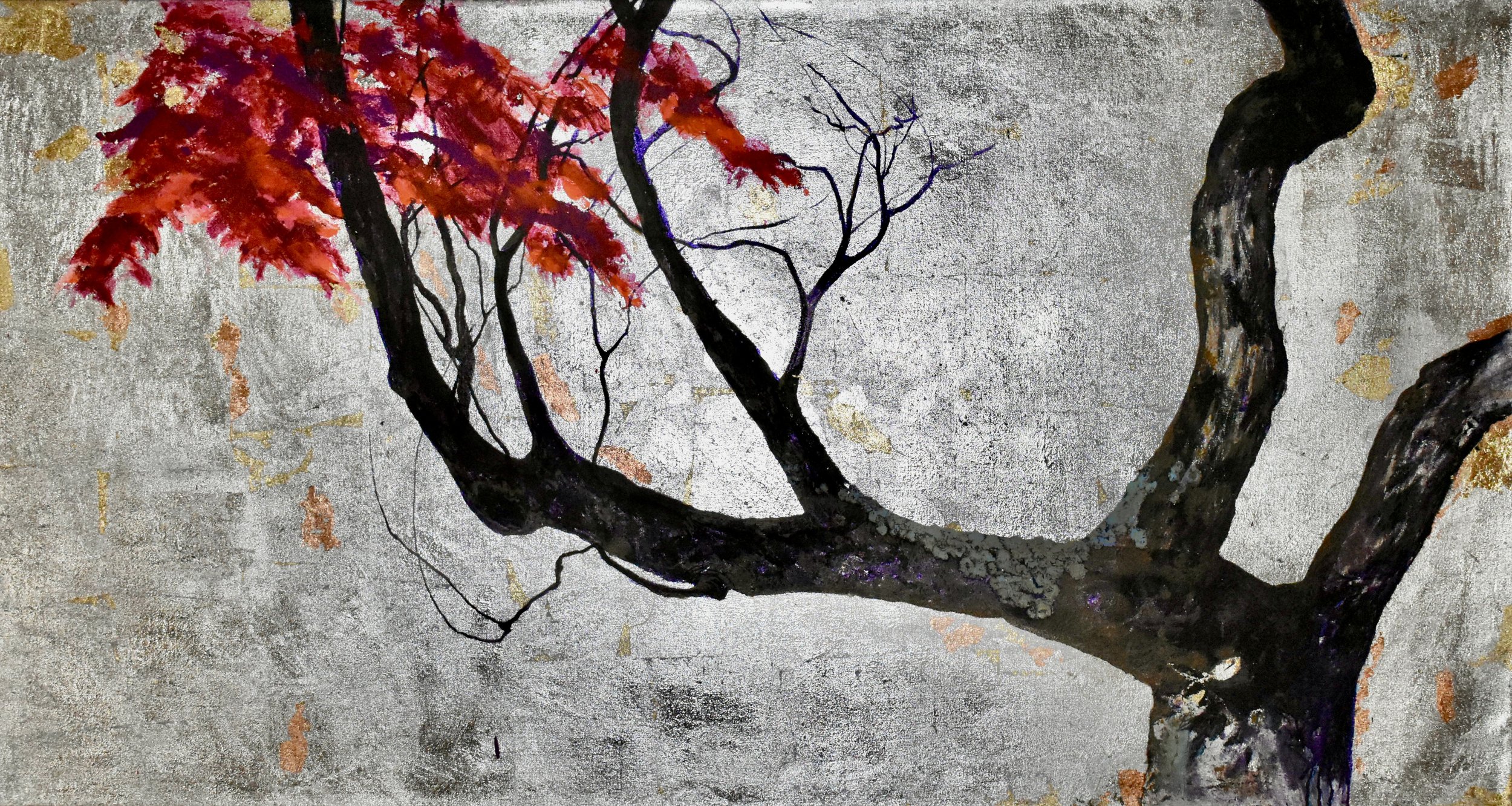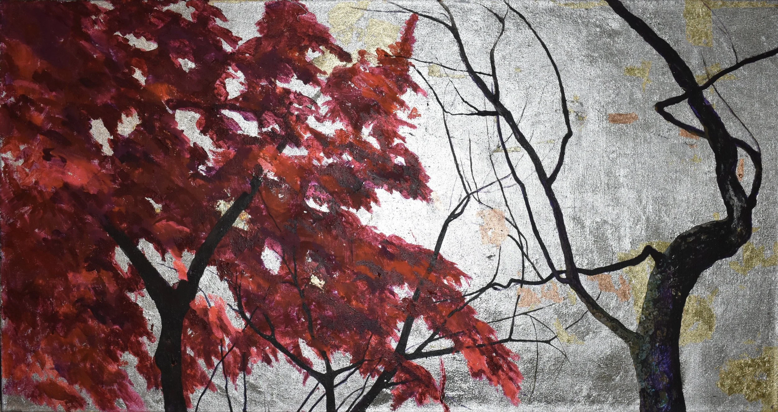 Acer palmatum,2023, ink, pigments and silver leaves on canvas, 90 x 170 cm