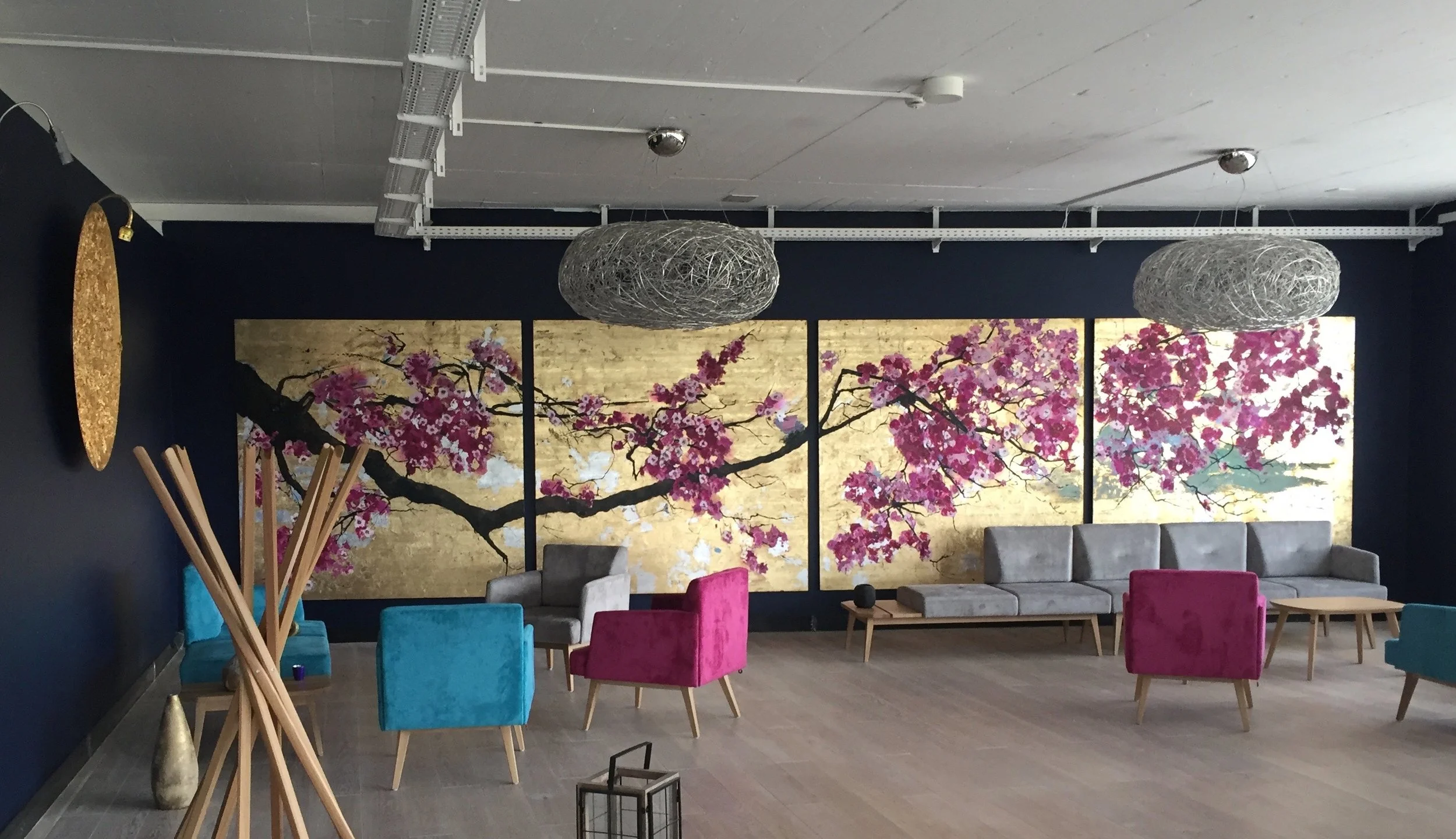 Cherry blossom,2021,ink and etching on gold leaves on wood, 200 x 800cm