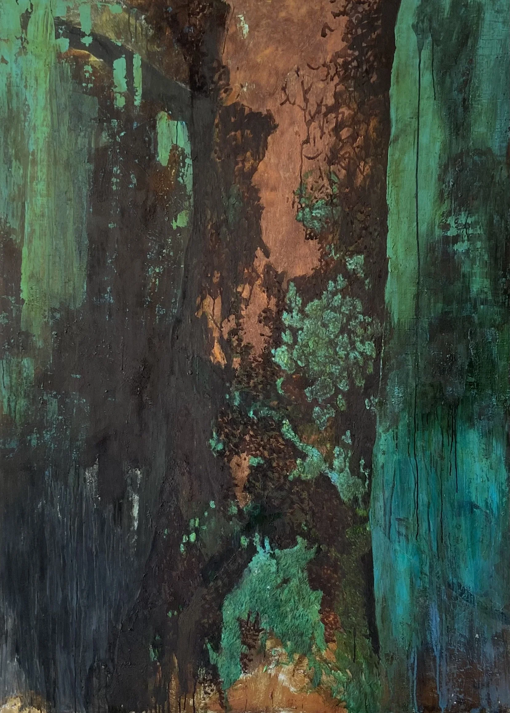 The transformation of natural phenomena into painting or material language, for me, is not about replication but about evocation. It’s an attempt to distill the essence of what I experience in nature—the unseen currents, the quiet violence of growth and decay, the way light can feel almost physical—into something that exists beyond the literal. It becomes a space where observation and abstraction are in constant dialogue, where the act of making is as much about listening as it is about creating. In the process I often let chance participate: resin flows uncontrollably, acid eats into metal. These "mistakes" show the transience - this is exactly what makes the works alive - I am not in total control of it and this is what supposed to evoke an echo in the viewer. The studio is where observation meets alchemy. I might start with a sketch or a photograph, but the work evolves through the act of making. There’s a lot of destruction and rebuilding—scraping away layers, sanding down surfaces, letting materials interact in ways I can’t fully control. It’s in those moments of surrender to the process that the work often finds its vitality. The fragility you mention is inherent in this approach; the pieces feel alive because they’re not fixed, not finalized, but caught in a state of becoming.