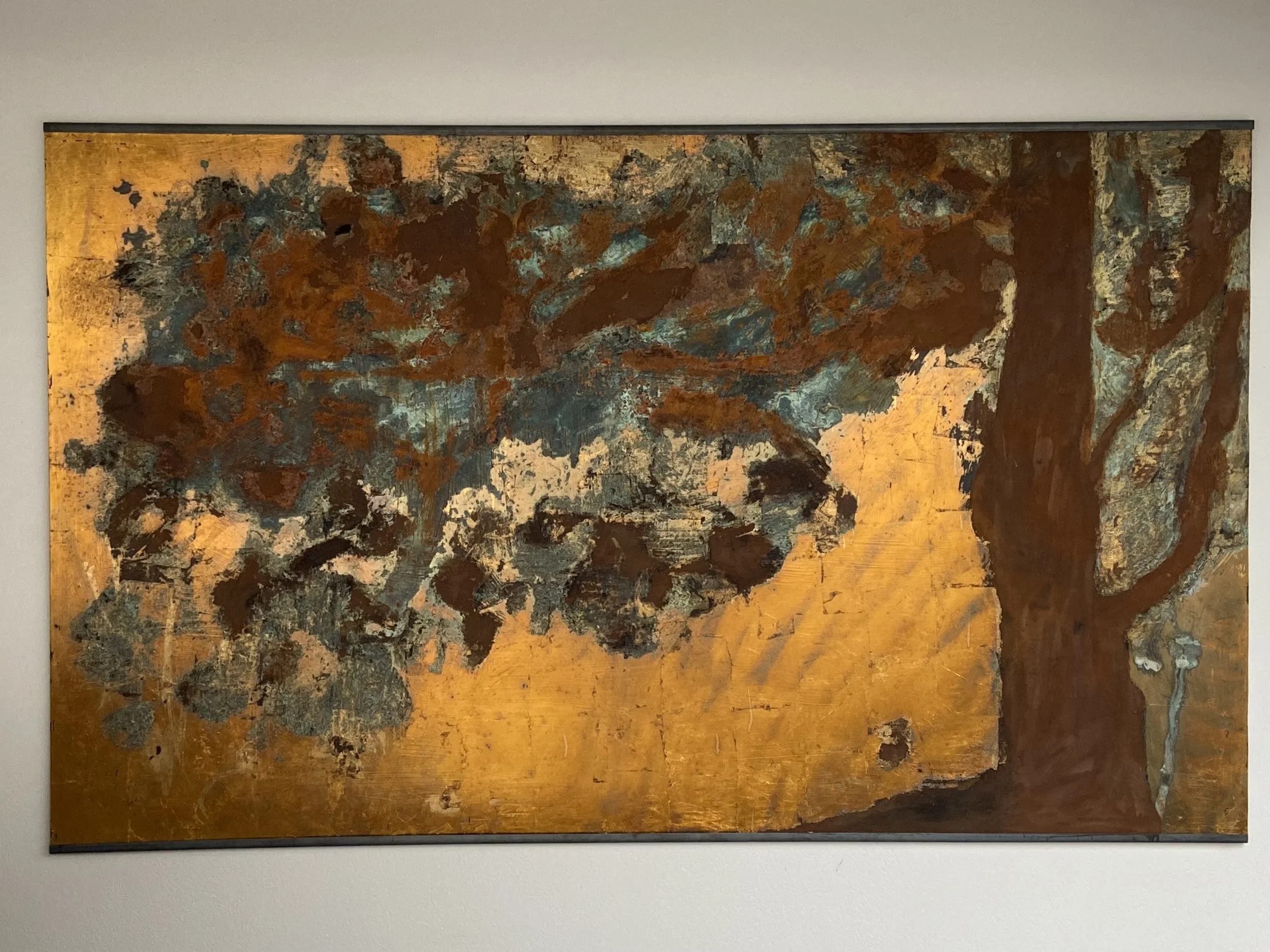 Branch,2022, gold, rust and etching on metal, 120 x 200 cm