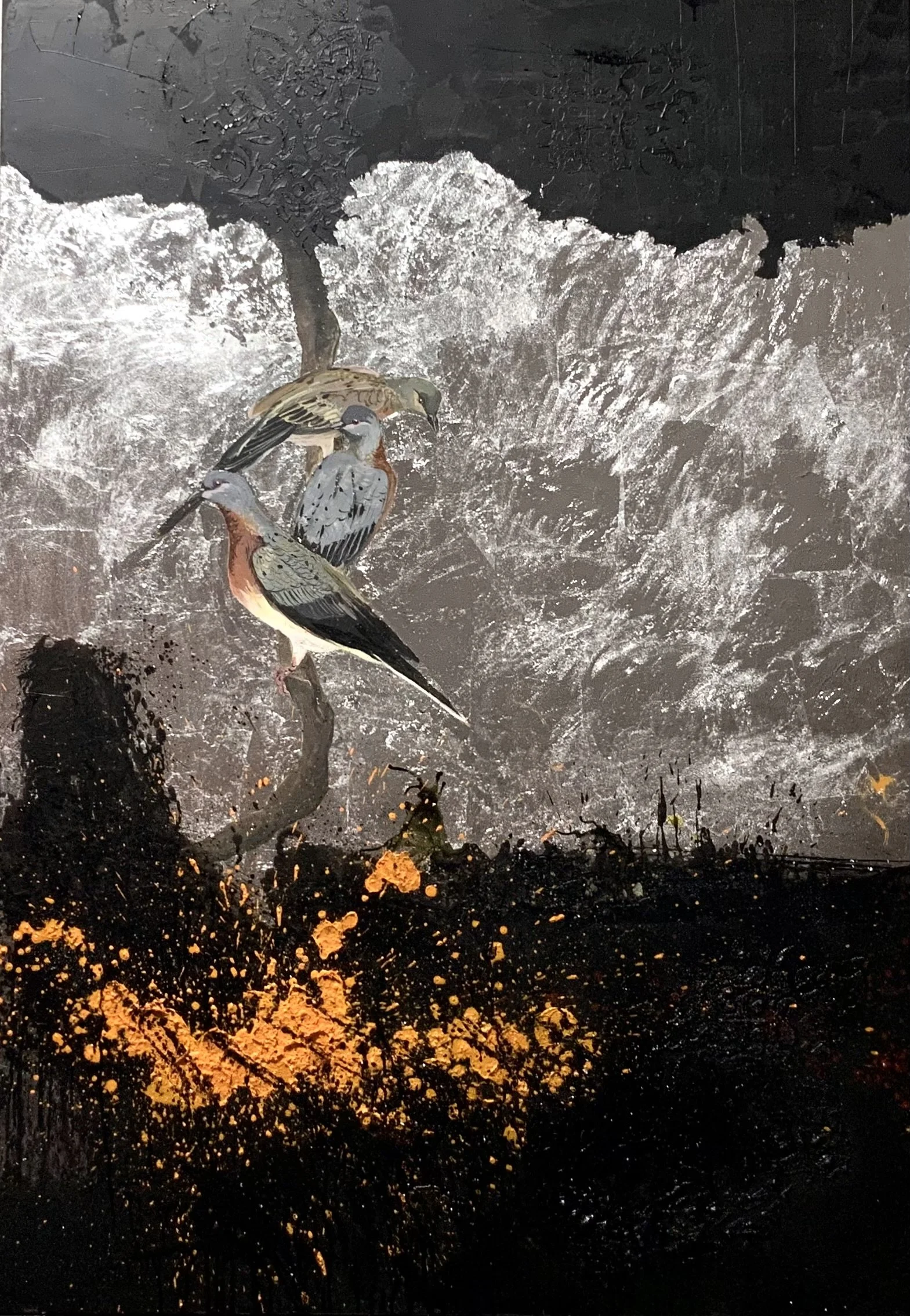 The Mystery of the Pigeons, 2026, ink, pigments and silver leaves on canvas, 140,x 170 cm
