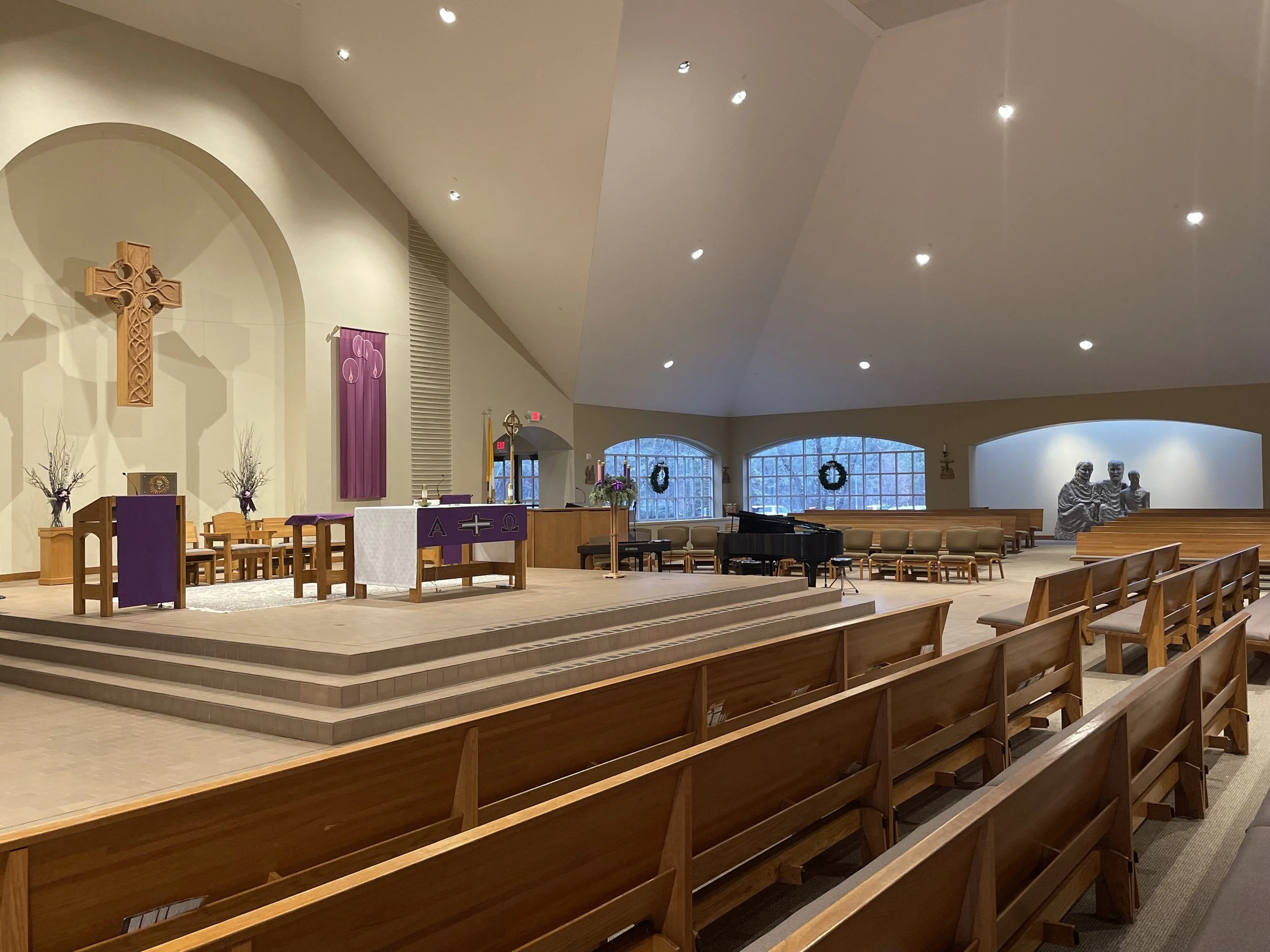 John O’Donahue’s Anam Cara is a concept of a soul friend. I embraced that we are soul friends with nature, that the natural world is not a backdrop to spiritual life but very integral. My materials and processes and beliefs were deepened in the seven years of sculpting with this interaction and journey. Materially, the local beach sand transform by melting into glass for the stained-glass ambry. Light activates the stained glass more than a manufactured transparency because it is from the earth. Granite erupted and was shaped by glaciers to be our villages’ bedrock. With heating and freezing to crack off shards as my carving process, then polishing pools as water will over time, my baptismal stone pools, flows and pools again. The Irish settlers might have cleared this bedrock stone from clearing the prairie for their farm. The water falling and slowing granite font came with an omnipresence of having been formed over millennia dwarfing our human tenancy. My oak Celtic cross, carved grandest wood in the local forest, dissolves the boundary between the living and the sacred. In some traditions wood never dies but lives on in its transformed carved and carpentry state.