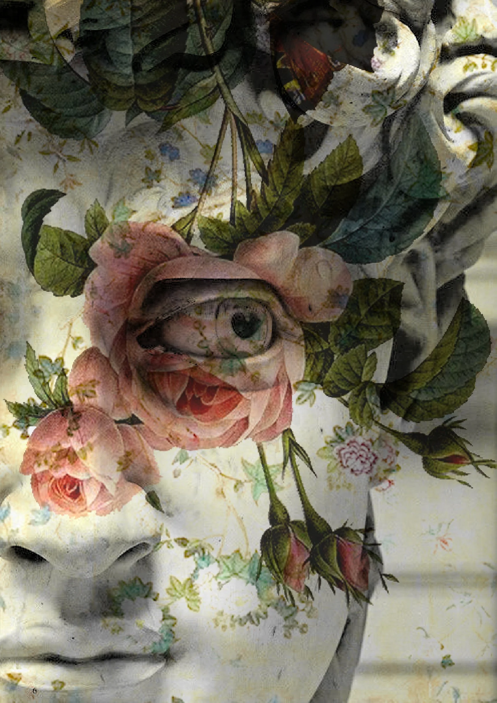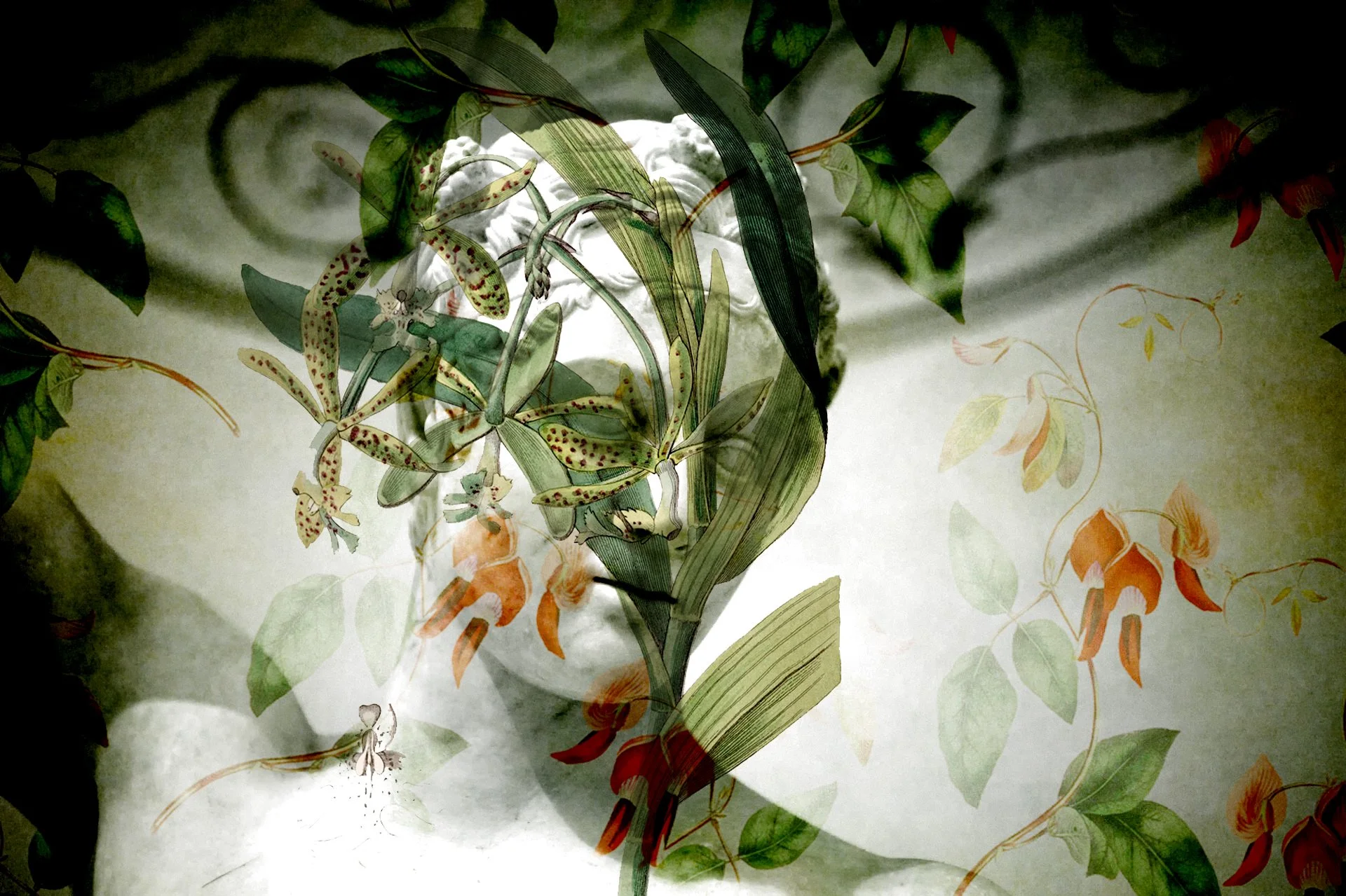 Through digital manipulation and photographic layering, the marble surface became a field of transformation. I began to imagine the white stone as a kind of skin, onto which new layers of meaning could be placed. Botanical elements, textures, and fragments gradually began to inhabit the sculpture—not as decoration, but as a form of awakening.