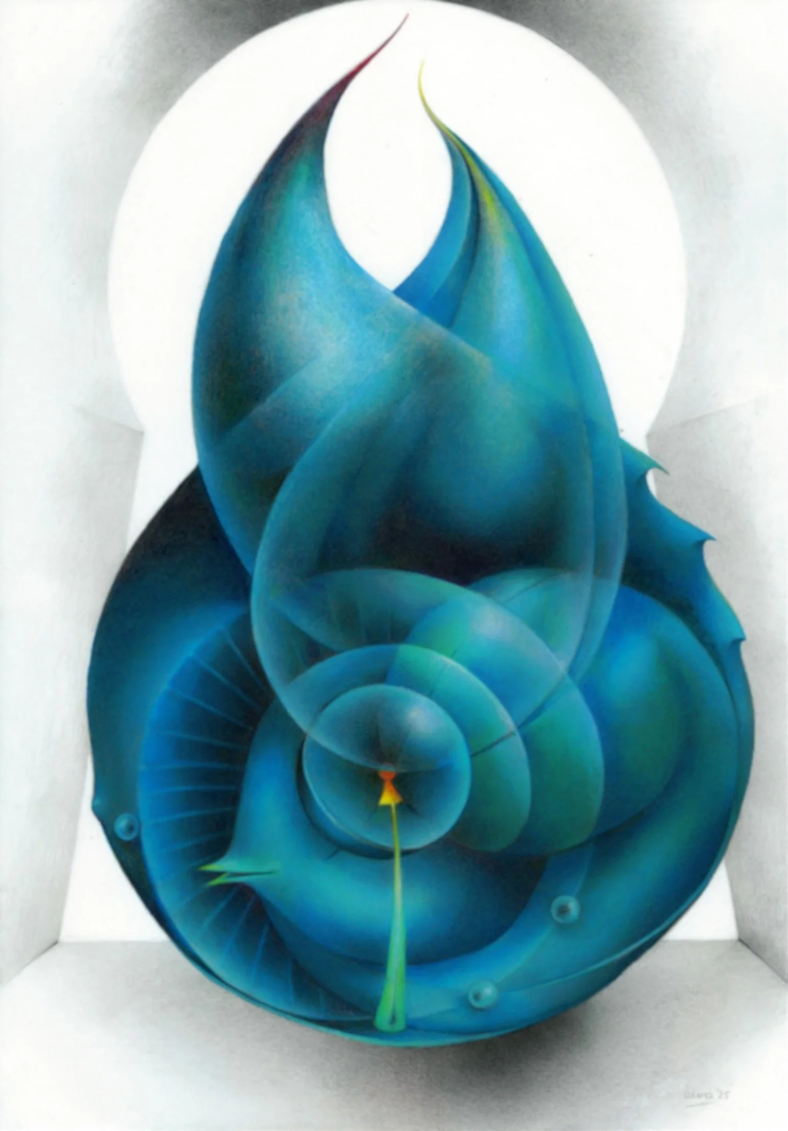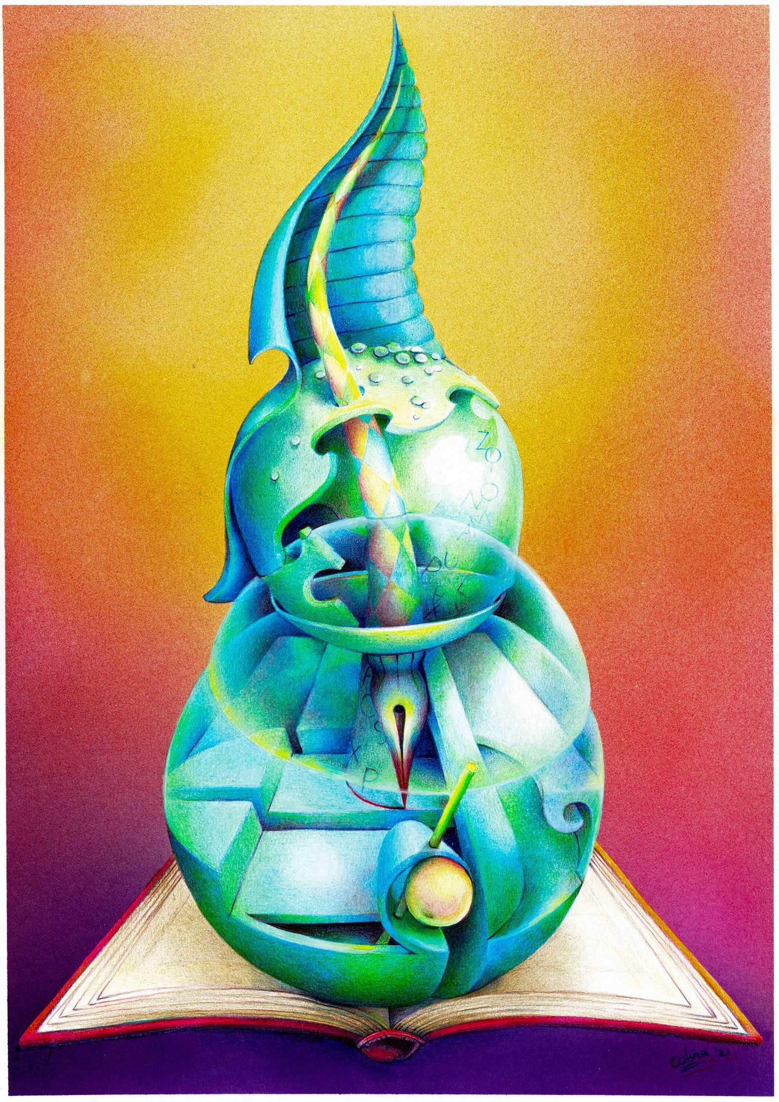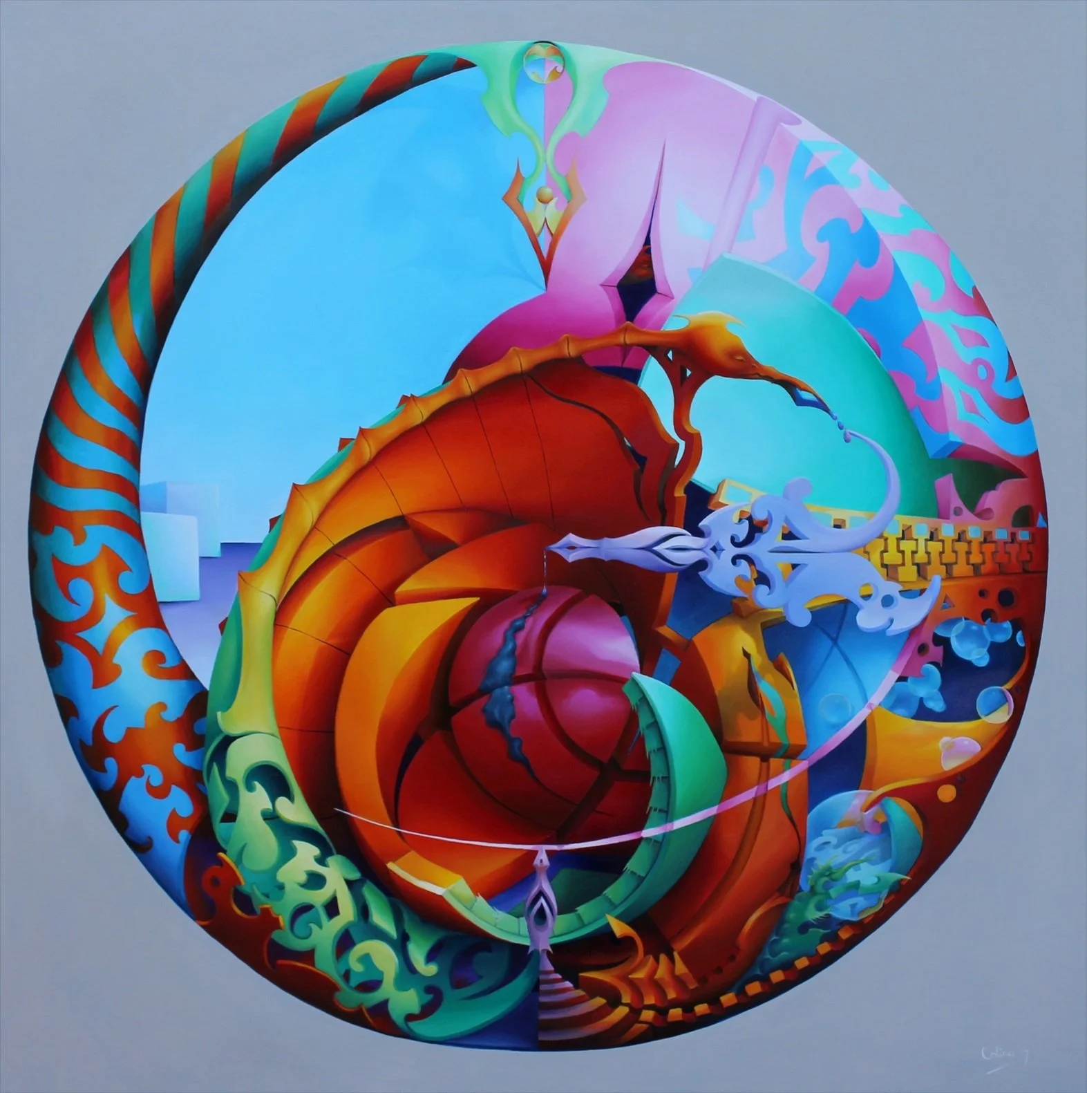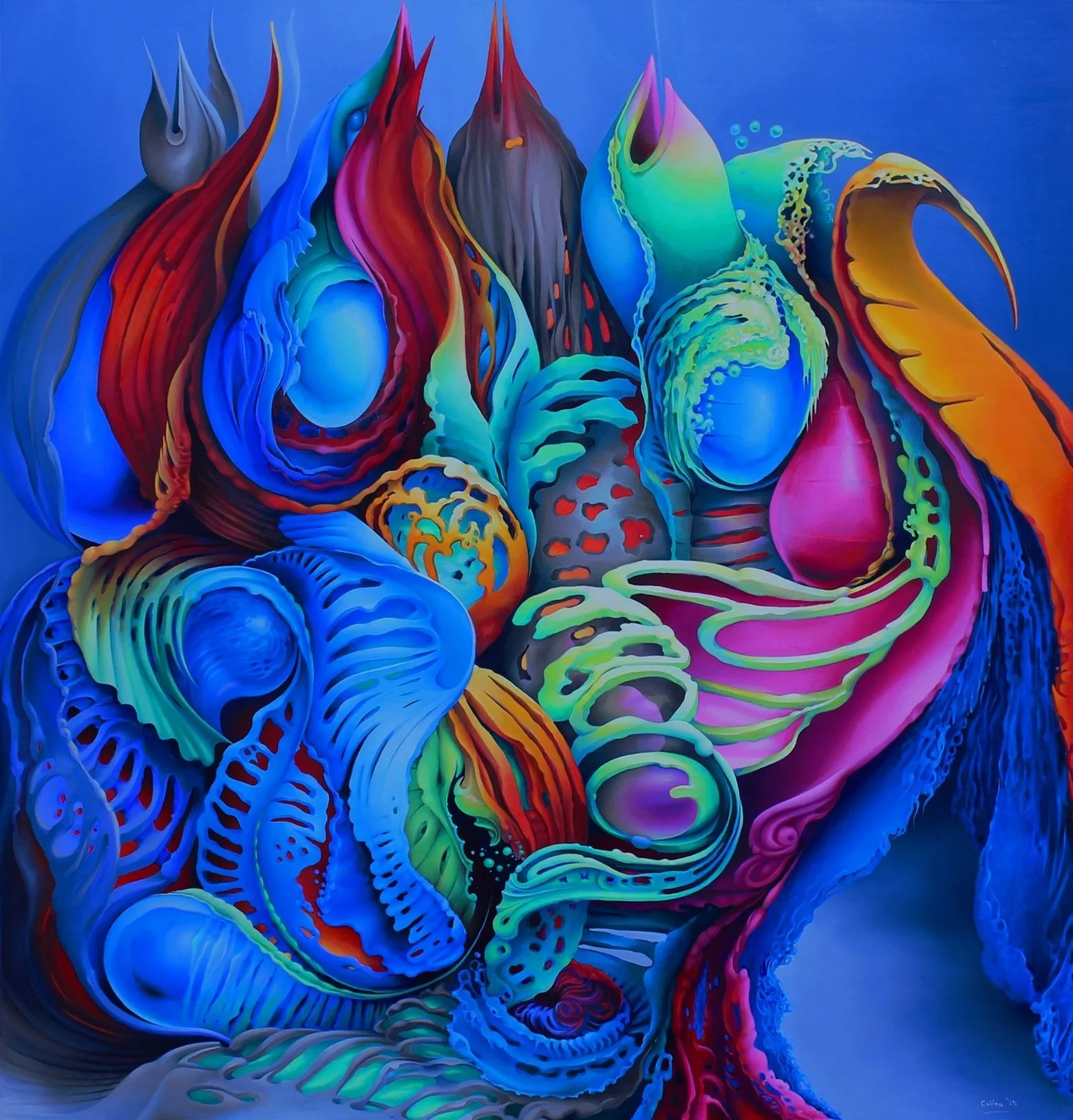 Symona Colina is a Dutch-born visual artist (born 1954). She lives and works in Italy, is known for both large canvases and intimate drawings that emphasise rhythm, line, and the sensation of movement, exploring perspective. Symona Colina’s practice bridges abstraction and lyrical figuration and layered spatial fields as organising metaphors. Perspective becomes a metaphysical realm rather than a purely technical device. Recurring motifs include vortex‑like forms, luminous orbs, and biomorphic structures rendered in saturated palettes. Symona Colina has exhibited at major fairs and institutions across Europe and the United States, including Palazzo Vecchio (Florence), Carrousel du Louvre (Paris) and numerous galleries and biennials in Rome, Amsterdam, Turin, and Prague.