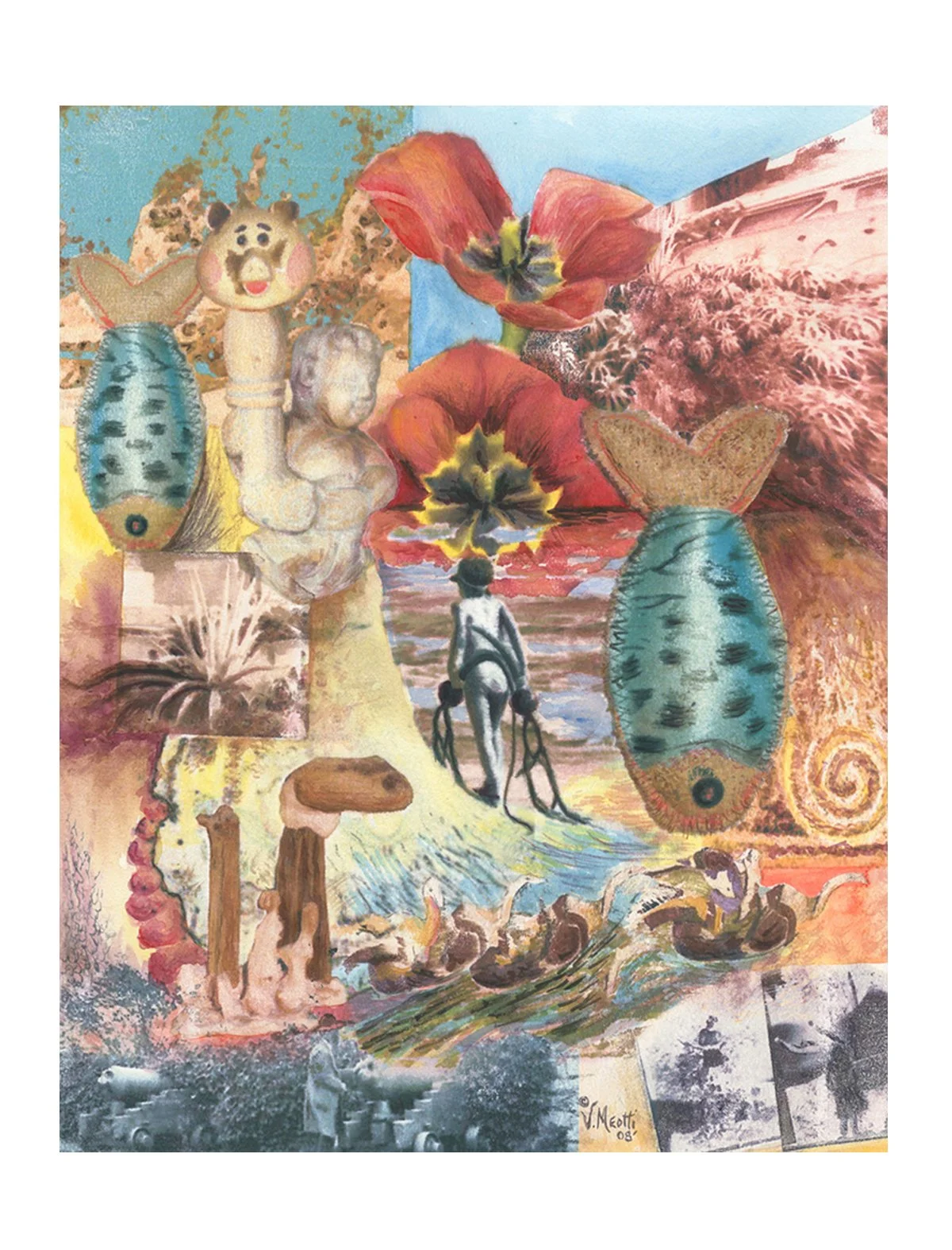 “Bombs Away” was created from my original photo collection. It symbolizes the loss of innocence and what you take away from it. The dropping fish symbolize destruction and the seaweed pods the girl is carrying into the sunset are intended to be what you take from past experiences and do not let go. The girl in center was from a series of four shots I took from the top of a cliff at the beach in La Jolla, Calif. I caught the images on my old Pentax Camera and have used the pictures in a few of my pieces. They are wonderful photographs of a young happy girl frolicking in the surf for some time with seaweed and then turning the corner of a cliff to go home with her new found friend which came in an unlikely form.