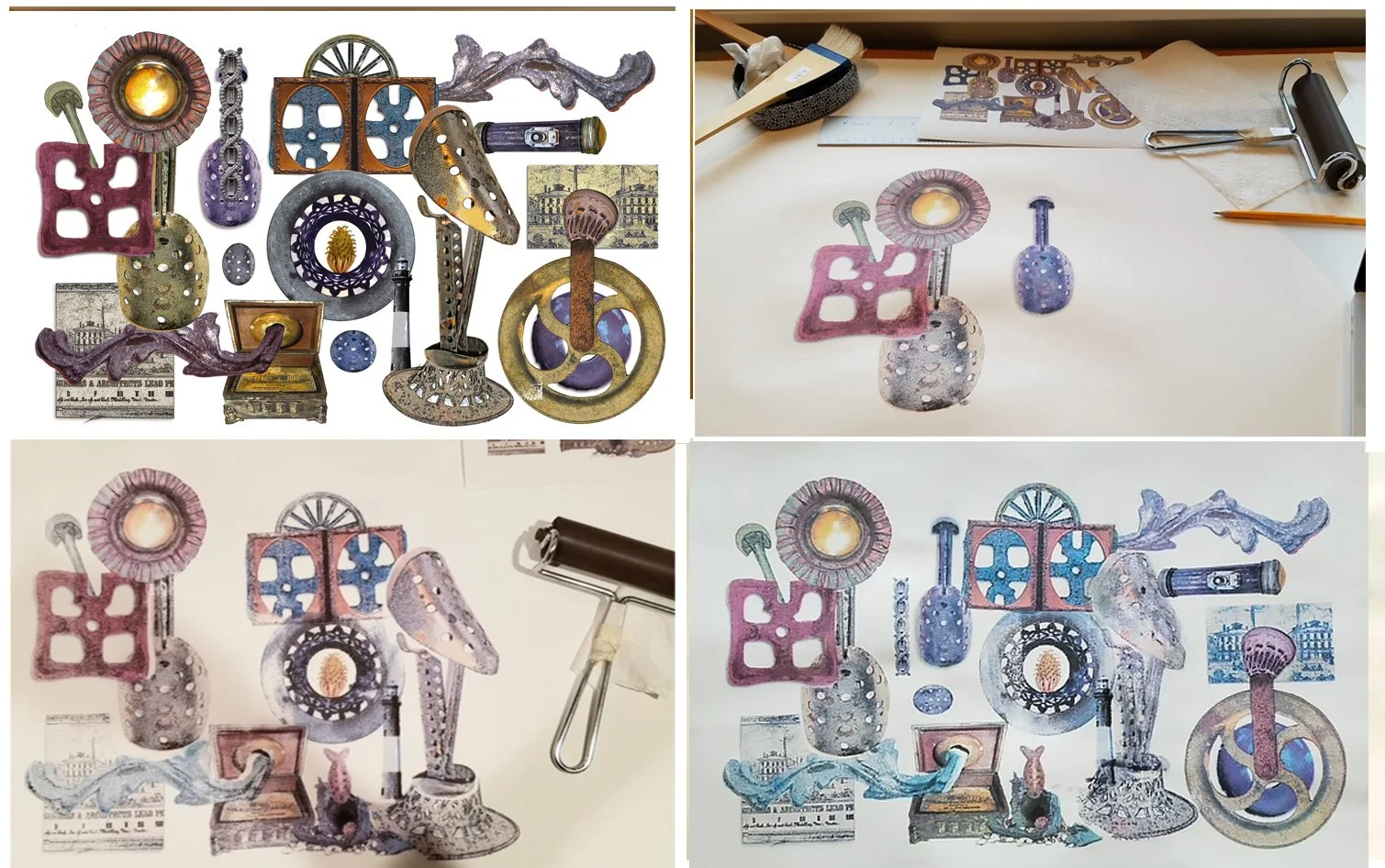 The process ULAE was using to create art was true Lithography at its core. Flat bed stone tablets hand etched by the artists then inked and pulled to dry before adding another element. This was the best of the best. Mr Rauschenberg had a huge library of photos and elements to incorporate into his art. He also had a troupe of mentors working on projects and learning from him. I went to see many of his exhibitions and had the honor to meet him and see the workings of the processes taken place at ULAE. It fueled my attention to the graphics of photography as well as layering, filtering and super imposing. Material textures, found objects and antiques with outdated usefulness seemed to accumulate. I was humbled and aspired to be a better artist every day. His practice of collecting images was my mission as well as creating sculpture and assemblages. My friend and coworker was an artist as well and we would collaborate on projects together. We saw new ways to incorporate cast-off press sheets out of the garbage bins into collage creations. We would cut the designs out of catalogs and sell-sheets and paste into designs, sometimes onto a structure. This moved me into sculpture and collage.