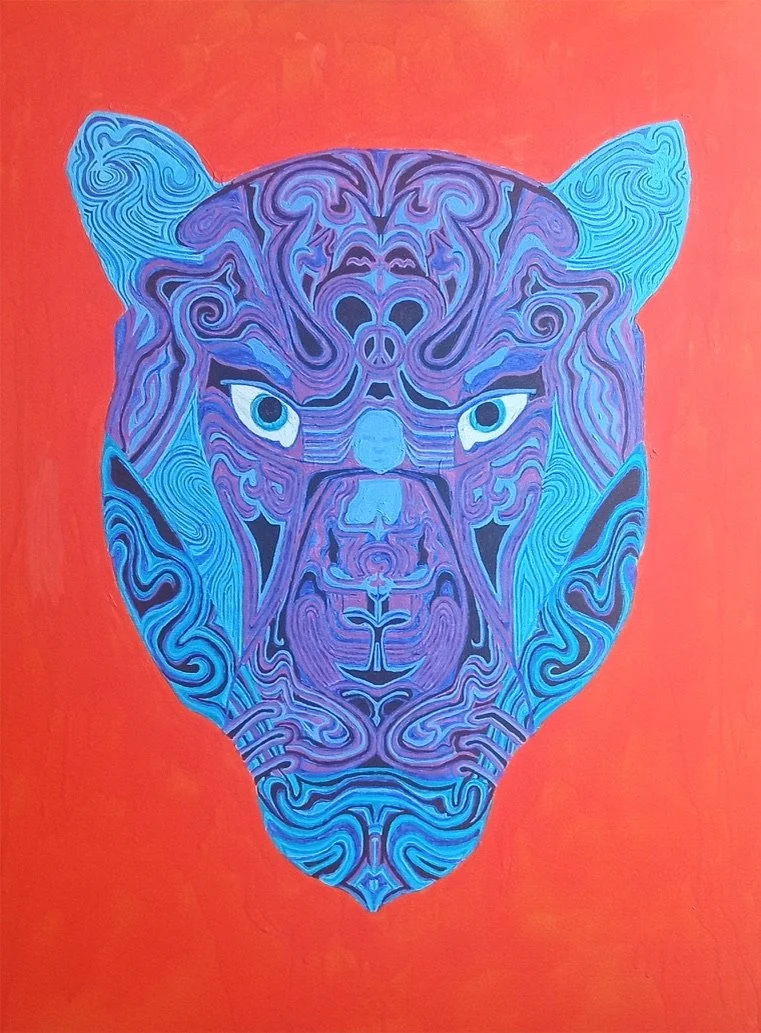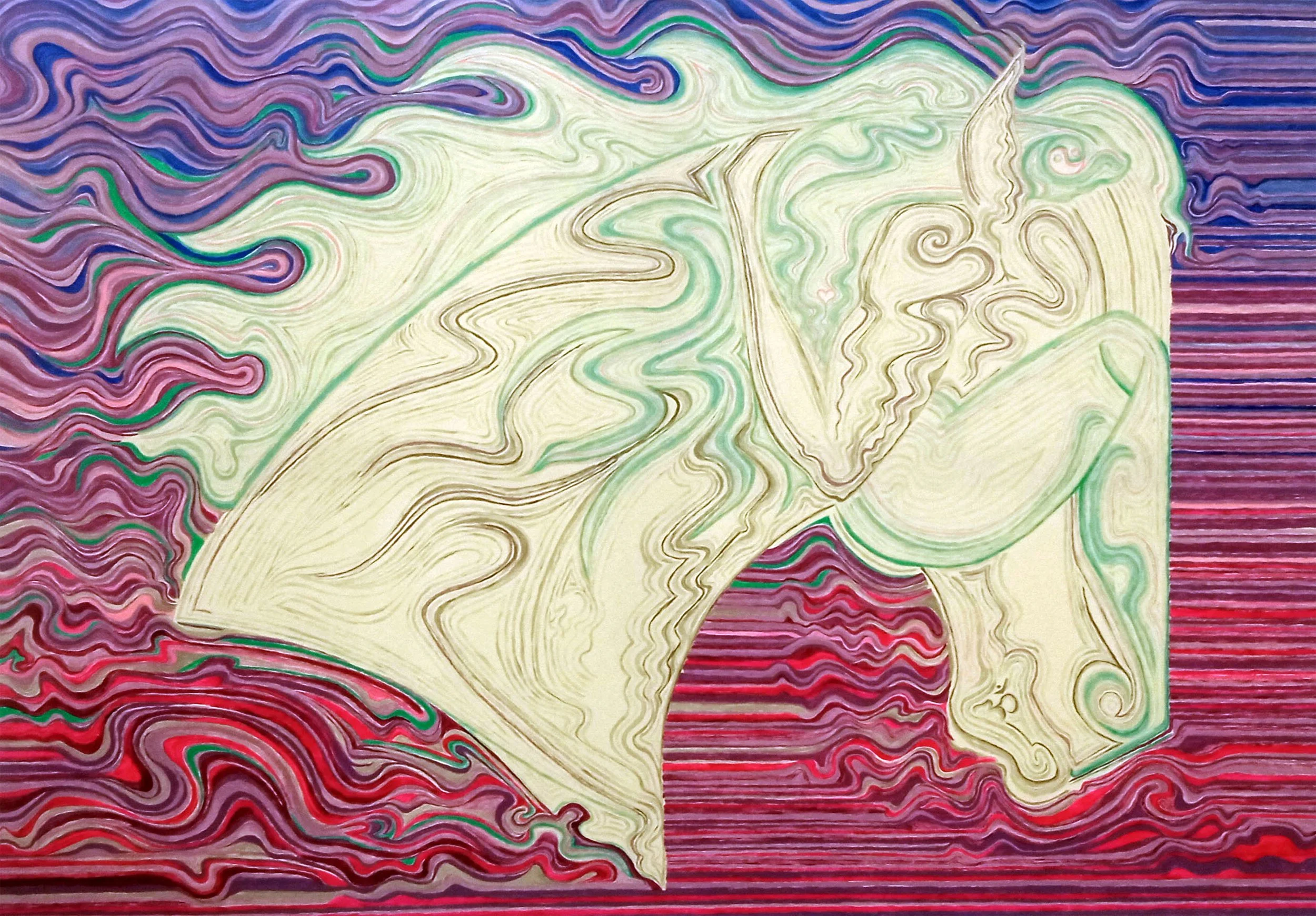 Palette modulation and spatial rhythm are very often overlooked in my paintings but is of great importance. In every painting, I tend to separate my palette in order to highlight four primary areas; the human couple, the animal and the space around them. This allows the viewer to discern the subtle changes in my palette which can possibly lead to their detection of these images within the animal form. I use Spatial rhythm for a similar effect whereas the slight differences in vibrating colors can determine where object end and begin. On my more recent works, the lateral vibrating lines in the background change when they come in contact with the animal form. I illustrate this by breaking the pattern of lines as they travel around, along and through the animal forms.